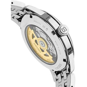 Stainless steel case with a stainless steel bracelet. Fixed stainless steel bezel. Black / blue dial with silver-tone hands and index hour markers. Minute markers around the outer rim. Dial Type: Analog. Date display at the 3 o'clock position. Seiko caliber 4R35 automatic movement, containing 23 Jewels, bitting at 21600 vph, and has a power reserve of approximately 41 hours. Scratch resistant Hardlex crystal. Pull / push crown. Transparent case back. Round case shape. Case size: 40.5 mm. Case thickness: 12 mm. Band width: 20 mm. Fold over clasp. Water resistant at 50 meters / 165 feet. Functions: date, hour, minute, second. Presage Series. Casual watch style. Seiko Presage Automatic Black Blue Dial Men's Watch SRPB41.