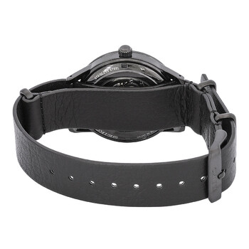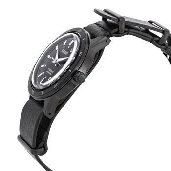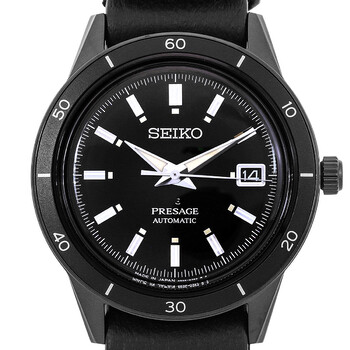 Black PVD stainless steel case with a black leather strap. Fixed black PVD stainless steel bezel. Black dial with silver-tone hands and index hour markers. Minute markers around the outer rim. Dial Type: Analog. Luminescent hands and markers. Date display at the 3 o'clock position. Seiko Caliber 4R35 Automatic movement, containing 23 Jewels, bitting at 21600 vph, and has a power reserve of approximately 41 hours. Scratch resistant Hardlex crystal. Pull / push crown. Transparent case back. Round case shape, case size: 40.8 mm, case thickness: 12 mm. Band width: 20 mm. Tang clasp. Water resistant at 50 meters / 165 feet. Functions: date, hour, minute, second. Presage Series. Casual watch style. Watch label: Japan Movt. Seiko Presage Automatic Black Dial Men's Watch SRPH95J1.