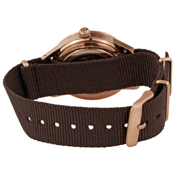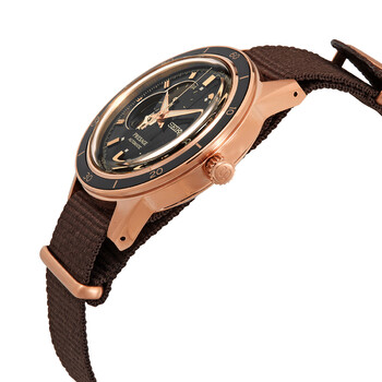 Rose gold-tone stainless steel case with a brown nylon strap. Fixed rose gold-tone bezel with an inlaid black ring. Black (open heart) dial with luminous rose gold-tone hands and index hour markers. Minute markers around the outer rim. Dial Type: Analog. Luminescent hands and markers. 24 hours subdials. Seiko caliber 4R39 automatic movement, containing 24 Jewels, bitting at 21600 vph, and has a power reserve of approximately 41 hours. Scratch resistant Hardlex crystal. Pull / push crown. Transparent case back. Round case shape. Case size: 40.8 mm. Case thickness: 12.8 mm. Tang clasp. Water resistant at 50 meters / 165 feet. Functions: hour, minute, second. Presage Series. Dress watch style. Watch label: Japan Movt. Seiko Presage Automatic Black Dial Men's Watch SSA426J1.