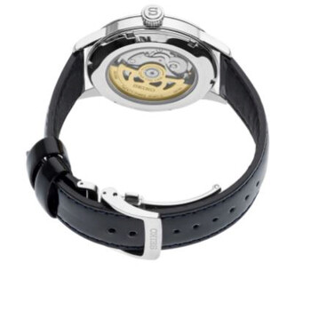 Stainless steel case with a stainless steel bracelet. Fixed stainless steel bezel. Silver dial with blue hands and index hour markers. Minute markers around the outer rim. Dial Type: Analog. Date display at the 3 o'clock position. Seiko caliber 4R35 automatic movement, containing 23 Jewels, bitting at 21600 vph, and has a power reserve of approximately 41 hours. Scratch resistant mineral crystal. Pull / push crown. Transparent case back. Round case shape. Case size: 40.5 mm. Case thickness: 12.7 mm. Band width: 22 mm. Fold over clasp with a push button release. Water resistant at 50 meters / 165 feet. Functions: date, hour, minute, second. Presage Series. Casual watch style. Seiko Presage Quartz Silver Dial Stainless Steel Men's Watch SRPB77.