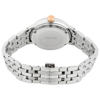 Silver-tone stainless steel case and bracelet. Fixed silver-tone stainless steel bezel. White dial with rose gold-tone hands and diamond and index hour markers. Minute markers around the outer rim. Dial Type: Analog. Date display at the 3 o'clock position. Seiko Caliber 2R05 automatic movement with a 41-hour power reserve. Scratch resistant Hardlex crystal. Pull / push crown. Solid case back. Round case shape, case size: 30.3 mm, case thickness: 10.9 mm. Band width: 14 mm. Deployment with push button release clasp. Water resistant at 50 meters / 165 feet. Functions: date, hour, minute, second. Presage Cocktail Series. Casual watch style. Watch label: Japan Movt. Seiko Presage Cocktail Automatic Diamond White Dial Ladies Watch SRE009J1.