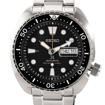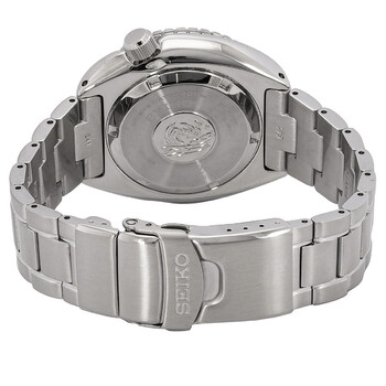 Silver-tone stainless steel case and bracelet. Uni-directional rotating black stainless steel bezel. Black dial with silver-tone hands and index hour markers. Minute scale around the inner rim. Dial Type: Analog. Luminescent hands and markers. Day/date display at the 3 o'clock position. Seiko Caliber 4R36 Automatic movement, containing 24 Jewels, bitting at 21600 vph, and has a power reserve of approximately 41 hours. Scratch resistant sapphire crystal. Screw down crown. Solid case back. Round case shape, case size: 45 mm, case thickness: 13.3 mm. Band width: 22 mm. Deployment with push button release clasp. Water resistant at 200 meters / 660 feet. Functions: date, day, hour, minute, second. Prospex Series. Dive watch style. Watch label: Japan Movt. Seiko Prospex Automatic Black Dial Men's Watch SRPE03.