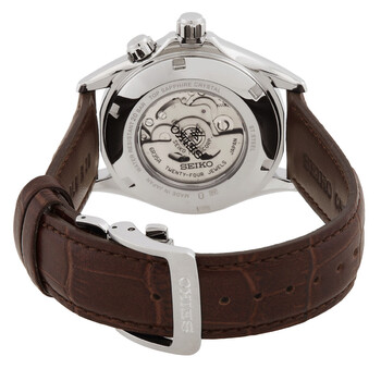 Silver-tone stainless steel case with a brown leather strap. Silver-tone bezel. Green dial with gold-tone hands and Arabic numeral, index hour markers. Dial Type: Analog. Date display at the 3 o'clock position. Seiko Caliber 6R35 automatic movement with a 70-hour power reserve. Scratch resistant sapphire crystal. Screw down crown. Transparent see through case back. Round case shape, case size: 39.5 mm, case thickness: 13.2 mm. Buckle clasp. Water resistant at 200 meters / 660 feet. Functions: date, hour, minute, second. Prospex Series. Watch label: Japan Movt. Seiko Prospex Automatic Green Dial Men's Watch SPB121J1.