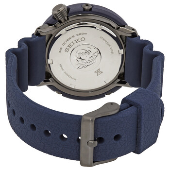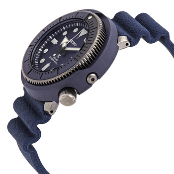 Stainless steel case with a blue silicone strap. Uni-directional rotating stainless steel bezel with a blue and grey ring. Blue dial with luminous silver-tone arrow-shaped hands and dot hour markers. Minute markers around the outer rim. Dial Type: Analog. Luminescent hands and markers. Date display at the 4 o'clock position. Seiko caliber V157 eco-drive movement. Scratch resistant Hardlex crystal. Screw down crown. Solid case back. Round case shape. Case size: 46.7 mm. Case thickness: 13 mm. Band width: 22 mm. Tang clasp. Water resistant at 200 meters / 660 feet. Functions: date, hour, minute, second, solar-powered. Dive watch style. Watch label: Japan Movt. Seiko Prospex Quartz Blue Dial Solar Men's Watch SNE533.
