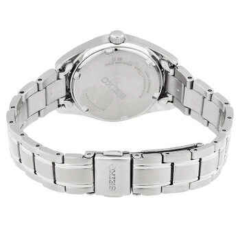 Silver-tone stainless steel case and bracelet. Fixed silver-tone stainless steel bezel. Blue dial with silver-tone hands and index hour markers. Minute markers around the outer rim. Dial Type: Analog. Luminescent hands and markers. Date display at the 3 o'clock position. Quartz movement. Scratch resistant sapphire crystal. Pull / push crown. Solid case back. Round case shape, case size: 30 mm, case thickness: 9 mm. Band width: 14 mm. Fold over with double push button release clasp. Water resistant at 100 meters / 330 feet. Functions: date, hour, minute, second. Casual watch style. Seiko Quartz Blue Dial Ladies Watch SUR531P1.