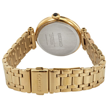 Gold-tone stainless steel case and bracelet. Fixed gold-tone bezel. White dial with gold-tone hands and crystal hour markers. Dial Type: Analog. Seiko caliber 7N01 quartz movement. Scratch resistant sapphire crystal. Pull / push crown. Solid case back. Round case shape. Case size: 30 mm. Case thickness: 6.3 mm. Band width: 13 mm. Fold over clasp with a safety release. Water resistant at 50 meters / 165 feet. Functions: hour, minute, second. Dress watch style. Watch label: Japan Movt. Seiko Quartz Crystal White Dial Ladies Watch SRZ536P1.
