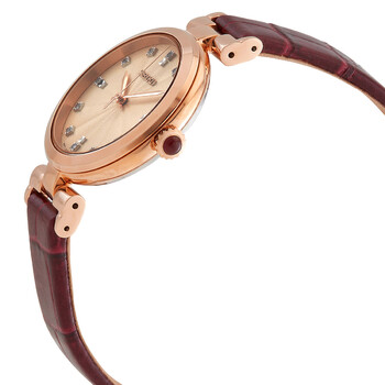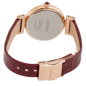 Rose gold-tone stainless steel case with a red brown leather strap. Fixed rose gold-tone stainless steel bezel. Rose dial with rose gold-tone hands and diamond hour markers. Dial Type: Analog. Seiko Caliber 7N01 quartz movement. Scratch resistant sapphire crystal. Pull / push crown. Solid case back. Round case shape, case size: 30 mm, case thickness: 6.3 mm. Three-fold with push button release clasp. Water resistant at 50 meters / 165 feet. Functions: hour, minute. Dress watch style. Watch label: Japan Movt. Seiko Quartz Diamond Ladies Watch SRZ548P1.