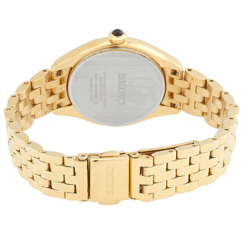 Gold-tone stainless steel case and bracelet. Fixed gold-tone stainless steel bezel. Silver dial with gold-tone hands and Arabic numeral hour markers. Dial Type: Analog. Quartz movement. Scratch resistant Hardlex crystal. Pull / push crown. Solid case back. Round case shape, case size: 29 mm, case thickness: 7 mm. Band width: 13 mm. Fold over clasp with a safety release. Water resistant at 50 meters / 165 feet. Functions: hour, minute, second. Dress watch style. Watch label: Japan Movt. Seiko Quartz Silver Dial Ladies Watch SUR384P1.