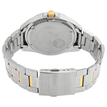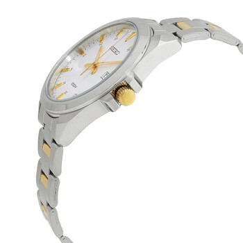 Stainless steel case with a two-tone (silver-tone and gold-tone) stainless steel bracelet. Fixed stainless steel bezel. Silver-tone dial with luminous gold-tone hands and index hour markers. Arabic numeral minute markers (at 5 minute intervals). Minute markers around the outer rim. Dial Type: Analog. Luminescent hands. Date display at the 3 o'clock position. Seiko caliber 6N42 quartz movement. Scratch resistant Hardlex crystal. Pull / push crown. Solid case back. Round case shape. Case size: 42 mm. Case thickness: 10 mm. Deployment clasp. Water resistant at 100 meters / 330 feet. Functions: date, hour, minute, second. Casual watch style. Watch label: Japan Movt. Seiko Quartz Silver Dial Men's Watch SUR211P1.