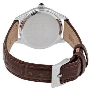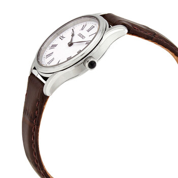Stainless steel case with a brown (calfskin) leather band. Fixed stainless steel bezel. White dial with silver-tone hands and Roman numeral hour markers. Minute markers around the outer rim. Dial Type: Analog. Seiko caliber 4N30 quartz movement. Scratch resistant sapphire crystal. Pull / push crown. Solid case back. Round case shape. Case size: 29 mm. Case thickness: 6.9 mm. Band width: 14 mm. Tang clasp. Water resistant at 50 meters / 165 feet. Functions: hour, minute. Casual watch style. Watch label: Japan Movt. Seiko Quartz White Dial Brown Leather Ladies Watch SWR071P1.
