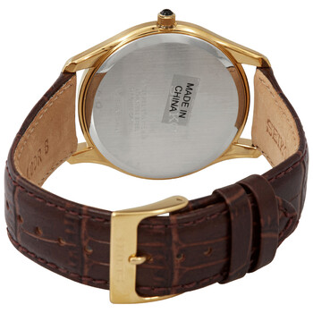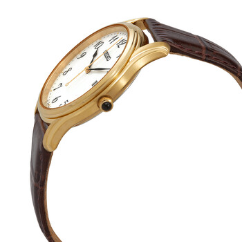 Gold-tone stainless steel case with a brown leather strap. Fixed gold-tone bezel. White dial with black hands and Arabic numeral hour markers. Minute markers around the outer rim. Dial Type: Analog. Date display at the 3 o'clock position. Seiko caliber 6N42 quartz movement. Scratch resistant sapphire crystal. Screw down crown. Solid case back. Round case shape. Case size: 39 mm. Case thickness: 8 mm. Band width: 20 mm. Tang clasp. Water resistant at 50 meters / 165 feet. Functions: date, hour, minute, second. Casual watch style. Watch label: Japan Movt. Seiko Quartz White Dial Men's Watch SUR306P1.