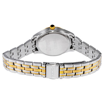 Stainless steel case with a two-tone (silver-tone and gold-tone) stainless steel bracelet. Fixed gold-tone bezel. White dial with silver-tone hands and Roman numeral hour markers. Minute markers around the outer rim. Dial Type: Analog. Seiko Caliber 4N30 quartz movement. Scratch resistant sapphire crystal. Pull / push crown. Solid case back. Round case shape. Case size: 29 mm. Case thickness: 6.9 mm. Band width: 14 mm. Fold over clasp with a safety release. Water resistant at 50 meters / 165 feet. Functions: hour, minute, second. Casual watch style. Watch label: Japan Movt. Seiko Quartz White Dial Two-tone Ladies Watch SWR070P1.