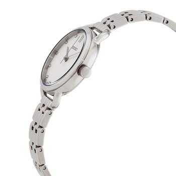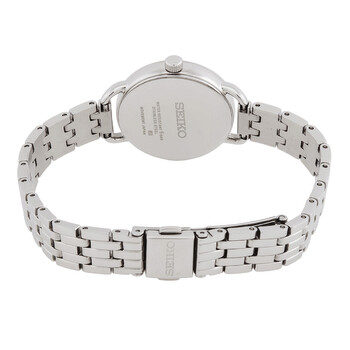 Silver-tone stainless steel case and bracelet. Fixed silver-tone stainless steel bezel. White dial with silver-tone hands and index hour markers. Dial Type: Analog. Seiko Caliber 6N01 quartz movement. Scratch resistant Hardlex crystal. Pull / push crown. Solid case back. Round case shape, case size: 26 mm, case thickness: 6 mm. Band width: 10 mm. Fold over clasp. Water resistant at 50 meters / 165 feet. Functions: hour, minute, second. Casual watch style. Watch label: Japan Movt. Seiko Quartz White Dial Watch SUR697P1.