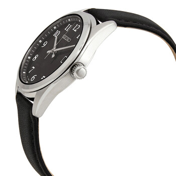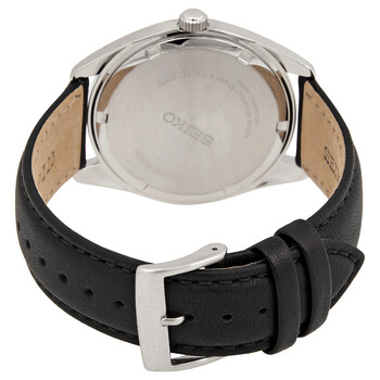 Stainless steel case with a black leather strap. Fixed stainless steel bezel. Black dial with luminous silver-tone hands and Arabic numeral hour markers. Minute markers around the outer rim. Dial Type: Analog. Luminescent hands and markers. Date display at the 3 o'clock position. Quartz movement. Scratch resistant sapphire crystal. Pull / push crown. Solid case back. Round case shape. Case size: 40 mm. Case thickness: 8.3 mm. Band width: 20 mm. Tang clasp. Water resistant at 100 meters / 330 feet. Functions: date, hour, minute, second. Sapphire Series. Casual watch style. Watch label: Japan Movt. Seiko Sapphire Quartz Black Dial Men's Watch SUR461P1.