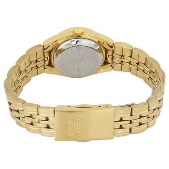 Yellow gold-tone stainless steel case and bracelet. Fixed yellow gold-tone bezel. Black dial with luminous yellow gold-tone hands and index hour markers. Minute markers around the outer rim. Dial Type: Analog. Luminescent hands and markers. Day of the week and date display at the 3 o'clock position. Seiko caliber 4207 automatic movement, containing 21 Jewels, bitting at 21600 vph, and has a power reserve of approximately 24 hours. Scratch resistant Hardlex crystal. Pull / push crown. Solid case back. Round case shape. Case size: 24 mm. Case thickness: 11 mm. Band width: 14 mm. Fold over clasp with a safety release. Water resistant at 30 meters / 100 feet. Functions: date, day, hour, minute, second. Series 5 Series. Casual watch style. Watch label: Japan Movt. Seiko Series 5 Automatic Black Dial Ladies Watch SYMA40.