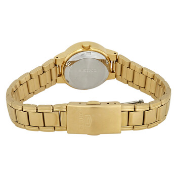 Yellow gold-tone stainless steel case and bracelet. Fixed yellow gold-tone bezel. Black dial with yellow gold-tone hands and index hour markers. Minute markers around the outer rim. Dial Type: Analog. Luminescent hands. Day of the week and date display at the 3 o'clock position. Seiko caliber 4207 automatic movement, containing 21 Jewels, bitting at 21600 vph, and has a power reserve of approximately 24 hours. Scratch resistant Hardlex crystal. Pull / push crown. Solid case back. Round case shape. Case size: 25 mm. Case thickness: 10 mm. Band width: 14 mm. Fold over clasp with a safety release. Water resistant at 30 meters / 100 feet. Functions: date, day, hour, minute, second. Additional Info: withstands rain and splashes of water, but not showering or submersion. Casual watch style. Seiko Series 5 Automatic Black Dial Ladies Watch SYME48.