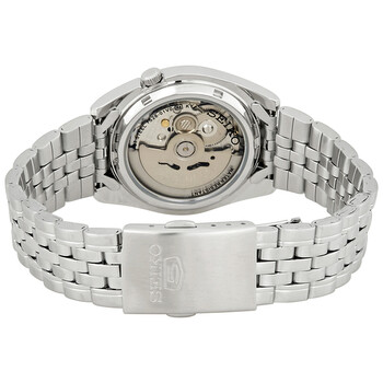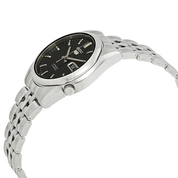 Stainless steel case with a stainless steel bracelet. Fixed smooth stainless steel bezel. Black dial with luminous silver-tone hands and index hour markers. Minute markers around the outer rim. Dial Type: Analog. Luminescent hands and markers. Day of the week and date display at the 3 o'clock position. Seiko caliber 7S26 automatic movement, based upon Seiko 7002, containing 21 Jewels, bitting at 21600 vph, and has a power reserve of approximately 40 hours. Scratch resistant Hardlex crystal. Pull / push crown. Transparent case back. Round case shape. Case size: 37 mm. Case thickness: 10.3 mm. Band width: 17 mm. Fold over clasp. Water resistant at 30 meters / 100 feet. Functions: date, day, hour, minute, second. Additional Info: withstands rain and splashes of water, but not showering or submersion. Series 5 Series. Dress watch style. Watch label: Japan Movt. Seiko Series 5 Automatic Black Dial Men's Watch SNK361.