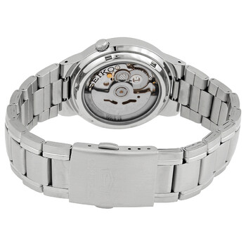 Stainless steel case with a stainless steel bracelet. Fixed stainless steel bezel. Blue dial with luminous silver-tone hands and index hour markers. Minute markers around the outer rim. Dial Type: Analog. Luminescent hands and markers. Day of the week and date display at the 3 o'clock position. Seiko caliber 7S26 automatic movement, based upon Seiko 7002, containing 21 Jewels, bitting at 21600 vph, and has a power reserve of approximately 40 hours. Scratch resistant Hardlex crystal. Pull / push crown. Transparent case back. Round case shape. Case size: 37 mm. Case thickness: 11 mm. Band width: 20 mm. Fold over clasp with a push button release. Water resistant at 30 meters / 100 feet. Functions: date, day, hour, minute, second. Series 5 Series. Casual watch style. Watch label: Japan Movt. Seiko Series 5 Automatic Blue Dial Men's Watch SNKA05K1.