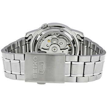 Stainless steel case with a stainless steel bracelet. Fixed stainless steel bezel. Blue dial with luminous silver-tone hands and stick hour markers. Minute markers around the outer rim. Dial Type: Analog. Luminescent hands and markers. Day of the week and date display at the 3 o'clock position. Seiko caliber 7S26C automatic movement with a 40-hour power reserve. Scratch resistant hardlex crystal. Pull / push crown. Skeleton case back. Round case shape. Case size: 39 mm. Case thickness: 11 mm. Band width: 18 mm. Fold over clasp with a safety release. Water resistant at 30 meters / 100 feet. Functions: date, day, hour, minute, second. Casual watch style. Watch label: Japan Movt. Seiko Series 5 Automatic Blue Dial Men's Watch SNKE51.