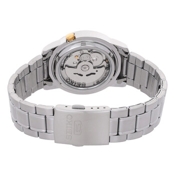 Silver-tone stainless steel case and bracelet. Fixed silver-tone stainless steel bezel. Blue dial with gold-tone hands and index hour markers. Minute markers around the outer rim. Dial Type: Analog. Luminescent hands and markers. Day of the week and date display at the 3 o'clock position. Seiko Caliber 7S26 Automatic movement, based upon Seiko 7002, containing 21 Jewels, bitting at 21600 vph, and has a power reserve of approximately 40 hours. Scratch resistant hardles crystal. Pull / push crown. Skeleton case back. Round case shape, case size: 38 mm, case thickness: 12 mm. Band width: 20 mm. Deployment with push button release clasp. Water resistant at 30 meters / 100 feet. Functions: date, day, hour, minute, second. Series 5 Series. Casual watch style. Seiko Series 5 Automatic Blue Dial Men's Watch SNKK11K1.