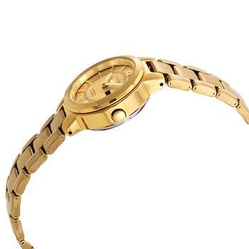 Gold-tone stainless steel case and bracelet. Fixed gold-tone bezel. Gold-tone dial with luminous gold-tone hands and index hour markers. Roman numerals mark the 6 and 12 o'clock position. Minute markers around an inner ring. Dial Type: Analog. Luminescent hands and markers. Day of the week and date display at the 3 o'clock position. Seiko caliber 4207 automatic movement with a 24-hour power reserve. Scratch resistant Hardlex crystal. Pull / push crown. Solid case back. Round case shape. Case size: 25 mm. Case thickness: 10 mm. Band width: 12 mm. Fold over clasp with a safety release. Water resistant at 30 meters / 100 feet. Functions: date, day, hour, minute, second. Casual watch style. Watch label: Japan Movt. Seiko Series 5 Automatic Gold Dial Ladies Watch SYME58.