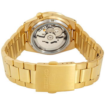 Yellow gold-tone stainless steel case and bracelet. Fixed yellow gold-tone bezel. Gold dial with luminous yellow gold-tone hands and index hour markers. Minute markers around the outer rim. Dial Type: Analog. Luminescent hands and markers. Day of the week and date display at the 3 o'clock position. Seiko caliber 7S26 automatic movement, based upon Seiko 7002, containing 21 Jewels, bitting at 21600 vph, and has a power reserve of approximately 40 hours. Scratch resistant Hardlex crystal. Pull / push crown. Transparent case back. Round case shape. Case size: 37 mm. Case thickness: 12 mm. Band width: 20 mm. Fold over clasp with a push button release. Water resistant at 50 meters / 165 feet. Functions: date, hour, minute, second. Series 5 Series. Casual watch style. Watch label: Japan Movt. Seiko Series 5 Automatic Gold Dial Men's Watch SNKE06K1.