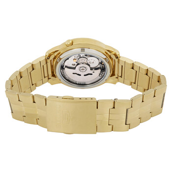 Yellow gold-tone stainless steel case and bracelet. Fixed smooth yellow gold-tone bezel. Gold dial with luminous yellow gold-tone hands and index hour markers. Minute markers around the outer rim. Dial Type: Analog. Luminescent hands and markers. Day of the week and date display at the 3 o'clock position. Seiko caliber 7S26 automatic movement, based upon Seiko 7002, containing 21 Jewels, bitting at 21600 vph, and has a power reserve of approximately 40 hours. Scratch resistant Hardlex crystal. Pull / push crown. Transparent case back. Round case shape. Case size: 38 mm. Case thickness: 12 mm. Band width: 18 mm. Fold over clasp with a safety release. Water resistant at 30 meters / 100 feet. Functions: date, day, hour, minute, second. Series 5 Series. Casual watch style. Watch label: Japan Movt. Seiko Series 5 Automatic Gold Dial Yellow Gold-tone Men's Watch SNKL86.