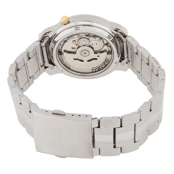 Silver-tone stainless steel case and bracelet. Fixed silver-tone stainless steel bezel. Gray dial with luminous yellow gold-tone hands and index hour markers. Minute markers around the outer rim. Dial Type: Analog. Luminescent hands and markers. Day of the week and date display at the 3 o'clock position. Seiko Caliber 7S26 Automatic movement, based upon Seiko 7002, containing 21 Jewels, bitting at 21600 vph, and has a power reserve of approximately 40 hours. Scratch resistant Hardlex crystal. Pull / push crown. Skeleton case back. Round case shape, case size: 38 mm, case thickness: 12 mm. Band width: 17 mm. Fold over clasp. Water resistant at 30 meters / 100 feet. Functions: date, day, hour, minute, second. Series 5 Series. Casual watch style. Watch label: Japan Movt. Seiko Series 5 Automatic Men's Watch SNKK67K1.