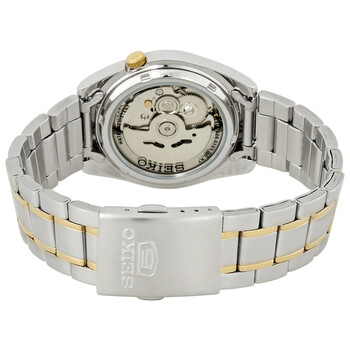 Stainless steel case with a two-tone (silver-tone and gold-tone) stainless steel bracelet. Fixed stainless steel bezel. White dial with luminous gold-tone hands and index hour markers. Minute markers around the outer rim. Dial Type: Analog. Luminescent hands. Day of the week and date display at the 3 o'clock position. Seiko caliber 7S26 automatic movement, based upon Seiko 7002, containing 21 Jewels, bitting at 21600 vph, and has a power reserve of approximately 40 hours. Scratch resistant mineral crystal. Pull / push crown. Transparent case back. Round case shape. Case size: 38 mm. Case thickness: 11 mm. Band width: 18 mm. Fold over clasp with a safety release. Water resistant at 30 meters / 100 feet. Functions: date, day, hour, minute, second. Series 5 Series. Casual watch style. Seiko Series 5 Automatic White Dial Men's Watch SNKL47.