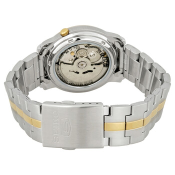 Stainless steel case with a two-tone (silver-tone and yellow gold-tone) stainless steel bracelet. Fixed smooth yellow gold-tone bezel. White dial with luminous yellow gold-tone hands and index hour markers. Minute markers around the outer rim. Dial Type: Analog. Luminescent hands. Day of the week and date display at the 3 o'clock position. Seiko caliber 7S26 automatic movement, based upon Seiko 7002, containing 21 Jewels, bitting at 21600 vph, and has a power reserve of approximately 40 hours. Scratch resistant hardlex crystal. Pull / push crown. Transparent case back. Round case shape. Case size: 36 mm. Case thickness: 11 mm. Band width: 19 mm. Deployment clasp with a push button release. Water resistant at 30 meters / 100 feet. Functions: date, day, hour, minute, second. Series 5 Series. Casual watch style. Watch label: Japan Movt. Seiko Series 5 Automatic White Dial Two-tone Men's Watch SNKL84.