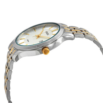 Stainless steel case with a two-tone (silver-tone and gold-tone) stainless steel bracelet. Fixed stainless steel bezel. Silver pattern dial with gold-tone hands and index hour markers. Minute markers around the outer rim. Dial Type: Analog. Date display at the 3 o'clock position. Seiko caliber 6N42 quartz movement. Scratch resistant hardlex crystal. Pull / push crown. Solid case back. Round case shape. Case size: 41 mm. Case thickness: 8 mm. Bracelet width: 18 mm. Fold over clasp. Water resistant at 100 meters / 330 feet. Functions: date, hour, minute, second. Casual watch style. Watch label: Japan Movt. Seiko Silver Pattern Dial Men's Two Tone Quartz Watch SUR295P1.