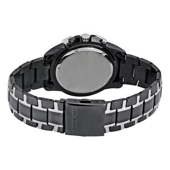 Stainless steel case with a two-tone (black PVD and silver-tone ) stainless steel bracelet. Fixed silver-tone and black PVD bezel. Black dial with luminous silver-tone hands and index hour markers. Minute markers. Tachymeter markings around the outer rim. Dial Type: Analog. Luminescent hands and markers. Date display at the 3 o'clock position. Chronograph - three sub-dials displaying: 60 second, 60 minute and 24 hour (alarm). Seiko caliber V172 eco-drive movement with a 6 month power reserve. Scratch resistant Hardlex crystal. Silver-tone crown. Solid case back. Round case shape. Case size: 44 mm. Case thickness: 12 mm. Band width: 22 mm. Fold over clasp. Water resistant at 100 meters / 330 feet. Functions: chronograph, alarm, date, hour, minute, second, tachymeter, solar-powered. Casual watch style. Watch label: Japan Movt. Seiko Solar Chronograph Black Dial Men's Watch SSC143.