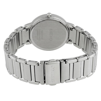 Silver-tone stainless steel case and bracelet. Fixed silver-tone bezel with crystal set. Mother of pearl dial with silver-tone hands and index hour markers. Dial Type: Analog. Eco-drive movement. Scratch resistant Hardlex crystal. Pull / push crown. Solid case back. Round case shape, case size: 30 mm, case thickness: 7 mm. Band width: 12 mm. Fold over with double push button release clasp. Water resistant at 30 meters / 100 feet. Functions: hour, minute. Casual watch style. Seiko Solar Mother of Pearl Dial Ladies Watch SUP467P1.