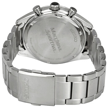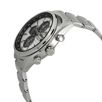 Silver-tone stainless steel case and bracelet. Fixed silver-tone stainless steel bezel. White dial with luminous black hands and index hour markers. Minute markers. Tachymeter markings around the outer rim. Dial Type: Analog. Luminescent hands and markers. Date display at the 3 o'clock position. Chronograph - three sub-dials displaying: 60 second, 60 minute and 1/10th of a second. Seiko Caliber V176 solar movement. Scratch resistant sapphire crystal. Pull / push crown. Solid case back. Round case shape, case size: 41.4 mm, case thickness: 12.1 mm. Band width: 20 mm. Deployment with push button release clasp. Water resistant at 100 meters / 330 feet. Functions: chronograph, tachymeter, date, hour, minute, second. Solar Series. Sport watch style. Watch label: Japan Movt. Seiko Solar White Dial Men's Watch SSC769P1.