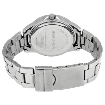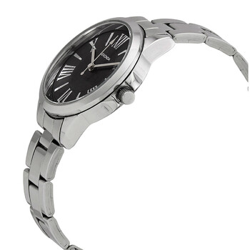 Silver-tone brass case with a stainless steel bracelet. Fixed silver-tone brass bezel. Black dial with silver-tone hands and alternating Roman numeral and index hour markers. Dial Type: Analog. Quartz movement. Scratch resistant mineral crystal. Pull / push crown. Solid case back. Round case shape. Case size: 36 mm. Case thickness: 9 mm. Band width: 16 mm. Fold over clasp with a safety release. Water resistant at 30 meters / 100 feet. Functions: hour, minute, second. Dress watch style. Watch label: Japan Movt. Sekonda Quartz Black Dial Stainless Steel Ladies Watch 2789.