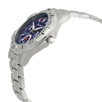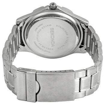 Silver-tone metal case with a silver-tone metal bracelet. Uni-directional rotating silver-tone metal bezel. Blue dial with luminous silver-tone hands and index hour markers. Arabic numeral minute markers (at 5 minute intervals). Minute markers around the outer rim. Dial Type: Analog. Luminescent hands and markers. Three multi-function sub-dials displaying: 24 hours, date and day of the week. Quartz movement. Scratch resistant mineral crystal. Pull / push crown. Solid case back. Round case shape. Case size: 43 mm. Fold over clasp with a safety release. Water resistant at 30 meters / 100 feet. Functions: date, day, hour, minute, second. Casual watch style. Watch label: Japan Movt. Sekonda Quartz Blue Dial Men's Watch 3114.