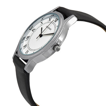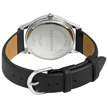 ` Silver-tone alloy case with a black leather strap. Fixed silver-tone alloy bezel. White dial with black hands and Roman numeral hour markers. Minute markers around an inner ring. Dial Type: Analog. Quartz movement. Scratch resistant mineral crystal. Pull / push crown. Solid case back. Round case shape. Case size: 36 mm. C46ase thickness: 7 mm. Tang clasp. Water resistant at 10 meters / 30 feet. Functions: hour, minute, second. Casual watch style. Watch label: Japan Movt. Sekonda Quartz White Dial Black Leather Men's Watch 3022.