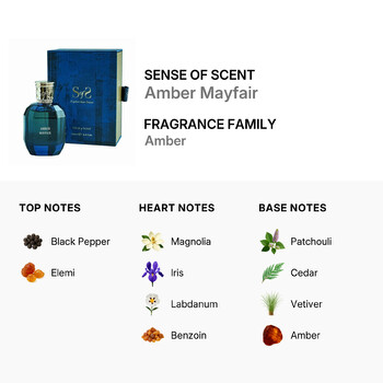 Amber Mayfair opens with vibrant top notes of black pepper and elemi, creating an invigorating and spicy introduction that captures attention. As the fragrance unfolds, heart notes of magnolia, iris, labdanum, and benzoin bloom, weaving a delicate and floral tapestry that is both elegant and inviting. The journey concludes with base notes of patchouli, cedar, vetiver, amber, and musk, which linger to leave a warm, earthy, and sensual finish.
