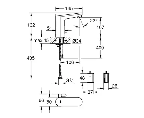 GROHE-ის ხელსაბნის შემრევი აღჭურვილია ინფრაწითელი სენსორით ორმხრივი კომუნიკაციისთვის, რაც უზრუნველყოფს მარტივ მონიტორინგს, კონფიგურაციასა და მომსახურებას. განკუთვნილია მონობლოკზე დასამონტაჟებლად და იყენებს გარე 6V ლითიუმის ელემენტს (CR-P2), რომლის ექსპლუატაციის ვადა დაახლოებით 7 წელია (150 გამოყენება დღეში), მრავალდონიანი დატენვის მაჩვენებლით.