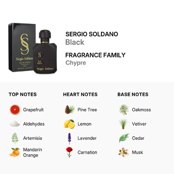 Belonging to the refined Chypre fragrance family, Sergio Soldano Black opens with a fresh burst of grapefruit, aldehydes, artemisia, mandarin orange, and bergamot. These vibrant top notes awaken the senses and set the tone for a dynamic and unforgettable experience. As the scent unfolds, a rich heart of pine tree, lemon, lavender, carnation, geranium, and jasmine adds depth, giving it a crisp, floral edge with a hint of earthiness.