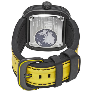 Dark gunmetal PVD stainless steel case with a yellow and black leather and silicone strap. Fixed dark gunmetal PVD stainless steel bezel. Yellow skeleton dial with luminous silver-tone and yellow hands and index hour markers. Minute markers around the outer rim. Dial Type: Analog. Luminescent hands. Two sub-dials displaying: 60 second and 24 hour. Miyota Caliber 82S7 Automatic movement, containing 21 Jewels, bitting at 21600 vph, and has a power reserve of approximately 40 hours. Scratch resistant mineral crystal. Pull / push crown. Solid case back. Square case shape, case size: 47.6 mm x 47 mm. Tang clasp. Water resistant at 30 meters / 100 feet. Functions: GMT, second time zone, hour, minute, small second, day/night indicator. Racing Team Series. Casual watch style. Watch label: Japan Movt. SevenFriday Racing Team Automatic Yellow Skeleton Dial Men's Watch P3B/03.