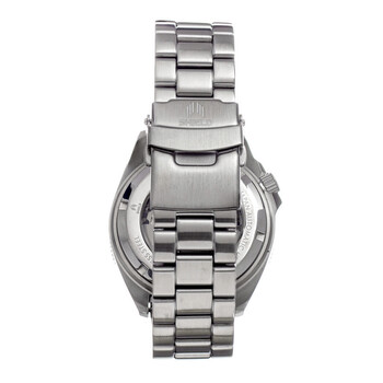 Stainless steel case with a stainless steel bracelet. Uni-directional rotating stainless steel bezel. Blue dial with luminous silver-tone arrow-shaped hands and dot hour markers. Dial Type: Analog. Luminescent hands and markers. Magnified date display at the 4 o'clock position. Automatic movement. Scratch resistant mineral crystal. Screw down crown. Transparent case back. Round case shape. Case size: 44 mm. Case thickness: 11 mm. Band width: 22 mm. Band length: 9 inches. Fold over clasp with a double push button release. Water resistant at 200 meters / 660 feet. Functions: date, hour, minute, second. Atlantis Series. Casual watch style. Watch label: Japan Movt. Shield Atlantis Automatic Blue Dial Men's Watch SLDSH108-5.
