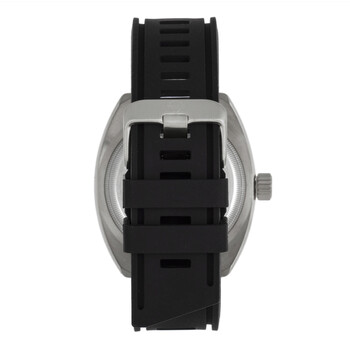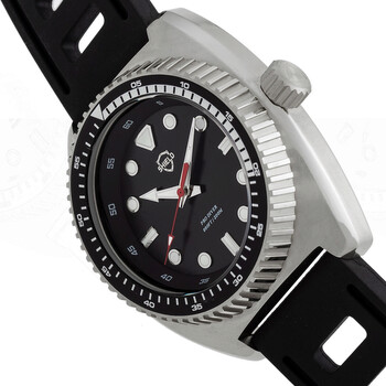 Silver-tone 316L surgical-quality stainless steel case with a black silicone strap. Uni-directional rotating black stainless steel bezel. Black dial with silver-tone hands and index hour markers. Dial Type: Analog. Luminescent hands and markers. Quartz movement. Scratch resistant mineral crystal. Screw down crown. Solid case back. Tonneau case shape, case size: 44 mm, case thickness: 15 mm. Band width: 22 mm. Buckle clasp. Water resistant at 200 meters / 660 feet. Functions: hour, minute, second. Dive watch style. Watch label: Japan Movt. Item Variations: SLDSH107-2. Shield Dreyer Quartz Black Dial Men's Watch SLDSH107-2.