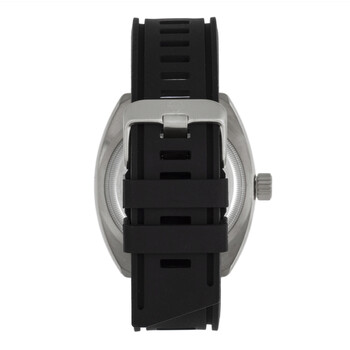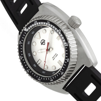 Silver-tone 316L surgical-quality stainless steel case with a black silicone strap. Uni-directional rotating black stainless steel bezel. White dial with silver-tone hands and index hour markers. Dial Type: Analog. Luminescent hands and markers. Quartz movement. Scratch resistant mineral crystal. Screw down crown. Solid case back. Tonneau case shape, case size: 44 mm, case thickness: 15 mm. Band width: 22 mm. Buckle clasp. Water resistant at 200 meters / 660 feet. Functions: hour, minute, second. Dive watch style. Watch label: Japan Movt. Item Variations: SLDSH107-1. Shield Dreyer Quartz White Dial Men's Watch SLDSH107-1.