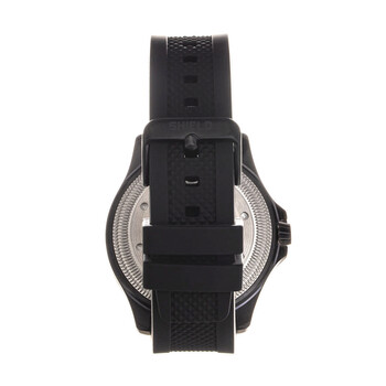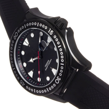 Black stainless steel case with a black silicone strap. Uni-directional rotating black stainless steel bezel. Black dial with black hands and index hour markers. Minute markers around the outer rim. Dial Type: Analog. Luminescent hands and markers. Date display at the 3 o'clock position. Quartz movement. Scratch resistant mineral crystal. Solid case back. Round case shape, case size: 45 mm, case thickness: 14 mm. Band width: 22 mm, band length: 8.75 inches. Buckle clasp. Water resistant at 200 meters / 660 feet. Functions: date, hour, minute, second. Freedive Series. Casual watch style. Watch label: Japan Movt. Shield Freedive Quartz Black Dial Men's Watch SLDSH115-6.