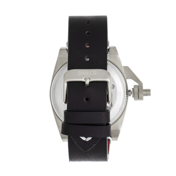 316L (surgical-quality) stainless steel case with a black leather strap. Fixed stainless steel bezel. Black dial with luminous silver-tone hands and Arabic numeral hour markers. Minute markers around the outer rim. Dial Type: Analog. Luminescent hands. Quartz movement. Scratch resistant mineral crystal. Screw down crown. Solid case back. Tonneau case shape. Case size: 42 mm. Case thickness: 13 mm. Band width: 22 mm. Tang clasp. Water resistant at 200 meters / 660 feet. Functions: hour, minute, second. Pascal Series. Dive watch style. Watch label: Japan Movt. Item Variations: SLDSH102-1. Shield Pascal Quartz Black Dial Black Leather Men's Watch SLDSH102-1.
