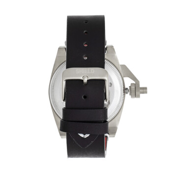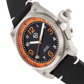 316L (surgical-quality) stainless steel case with a black leather strap. Fixed stainless steel bezel with an orange ring. Black dial with luminous silver-tone hands and Arabic numeral hour markers. Minute markers around the outer rim. Dial Type: Analog. Luminescent hands. Quartz movement. Scratch resistant mineral crystal. Screw down crown. Solid case back. Tonneau case shape. Case size: 42 mm. Case thickness: 13 mm. Band width: 22 mm. Tang clasp. Water resistant at 200 meters / 660 feet. Functions: hour, minute, second. Pascal Series. Dive watch style. Watch label: Japan Movt. Item Variations: SLDSH102-2. Shield Pascal Quartz Black Dial Black Leather Men's Watch SLDSH102-2.