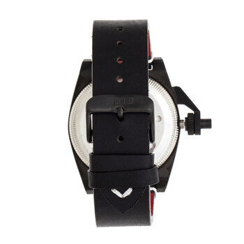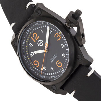 Black-plated 316L (surgical-quality) stainless steel case with a black leather strap. Fixed black-plated bezel. Black dial with luminous silver-tone hands and Arabic numeral hour markers. Minute markers around the outer rim. Dial Type: Analog. Luminescent hands. Quartz movement. Scratch resistant mineral crystal. Screw down crown. Solid case back. Tonneau case shape. Case size: 42 mm. Case thickness: 13 mm. Band width: 22 mm. Tang clasp. Water resistant at 200 meters / 660 feet. Functions: hour, minute, second. Pascal Series. Dive watch style. Watch label: Japan Movt. Item Variations: SLDSH102-6. Shield Pascal Quartz Black Dial Black Leather Men's Watch SLDSH102-6.