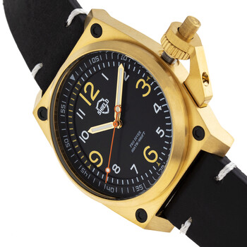 Gold-tone 316L (surgical-quality) stainless steel case with a black leather strap. Fixed gold-tone bezel. Black dial with luminous gold-tone hands and Arabic numeral hour markers. Minute markers around the outer rim. Dial Type: Analog. Luminescent hands. Quartz movement. Scratch resistant mineral crystal. Screw down crown. Solid case back. Tonneau case shape. Case size: 42 mm. Case thickness: 13 mm. Band width: 22 mm. Tang clasp. Water resistant at 200 meters / 660 feet. Functions: hour, minute, second. Pascal Series. Dive watch style. Watch label: Japan Movt. Item Variations: SLDSH102-5. Shield Pascal Quartz Black Dial Men's Watch SLDSH102-5.