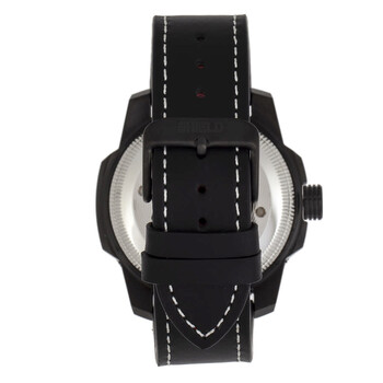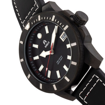 Black stainless steel case with a black genuine leather strap. Uni-directional rotating black stainless steel bezel. Black dial with silver-tone hands and index hour markers. Minute markers around the outer rim. Dial Type: Analog. Luminescent hands and markers. Date display at the 3 o'clock position. Quartz movement. Scratch resistant mineral crystal. Screw down crown. Solid case back. Round case shape, case size: 48 mm, case thickness: 16 mm. Band width: 22 mm, band length: 9 inches. Buckle clasp. Water resistant at 200 meters / 660 feet. Functions: date, hour, minute, second. Shaw Series. Casual watch style. Watch label: Japan Movt. Shield Shaw Black Dial Men's Watch SLDSH106-5.